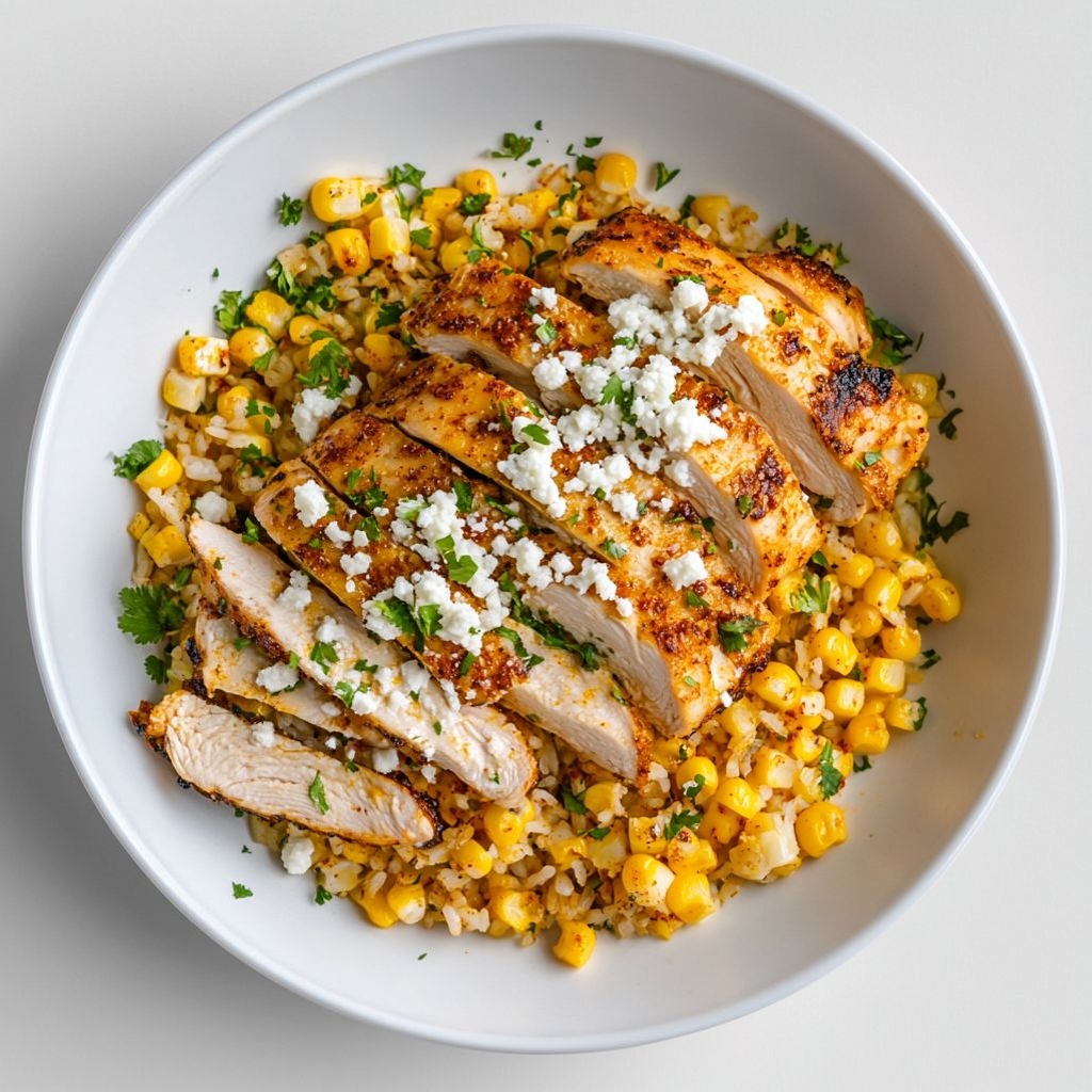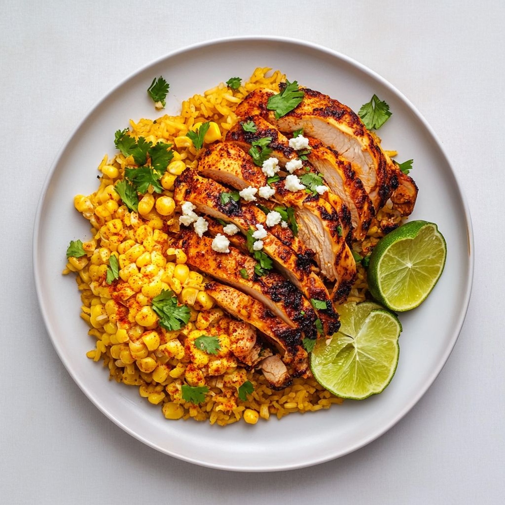 Serve the rice as the base, top with sliced chicken, and add a side of street corn. Garnish with fresh herbs, lime wedges, and a light sprinkle of extra cheese if desired. A simple scoring of hot sauce or extra chili powder can be offered at the table for heat seekers.