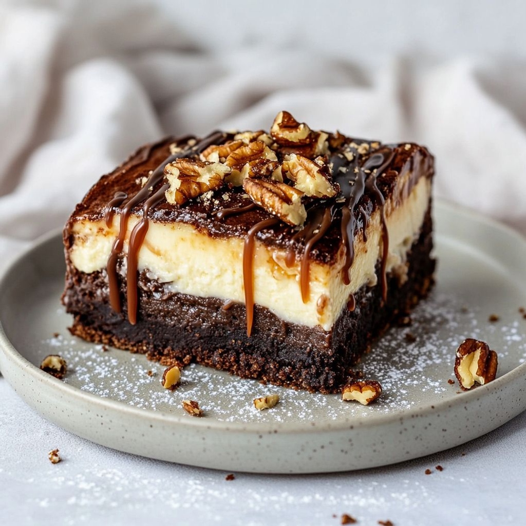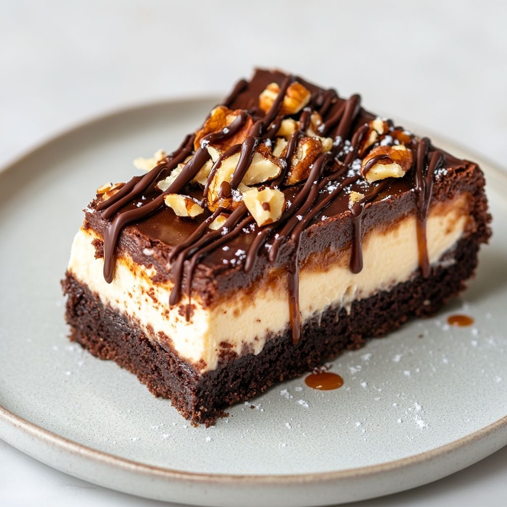 A decadent dessert that combines rich fudgy brownies with a creamy cheesecake swirl, finished with indulgent toppings like chocolate chips, caramel, and optional nuts. It’s a two-layer treat with a chewy brownie base and a smooth cheesecake center.