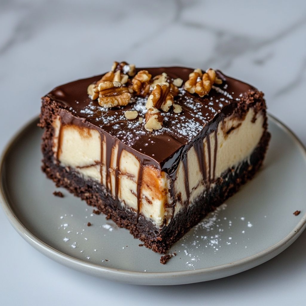 - Two beloved desserts in one glorious slice: fudgy brownie and creamy cheesecake, united under a glossy chocolate finish.