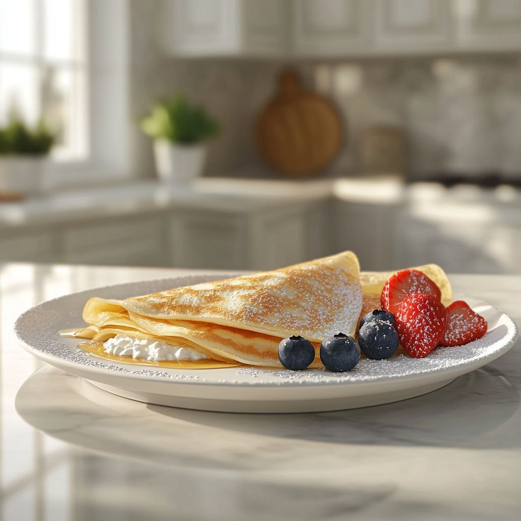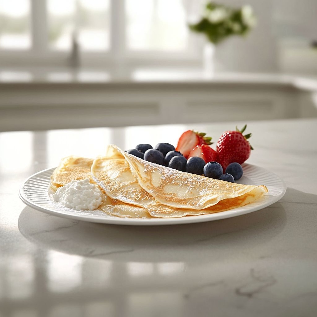 These cottage crepes are light, delicate, and versatile, featuring a creamy cottage cheese filling that balances tang with a touch of sweetness. For gluten-free meals, use gluten-free all‑purpose flour (or a GF blend with a pinch of xanthan gum) and let the batter rest 15–30 minutes to relax the starches for ultra-thin crepes that won’t tear. Whisk eggs with the milk before adding the flour, and cook in a lightly oiled skillet over medium heat, tilting the pan to spread a thin circle. If you want to make ahead, the batter can rest; the crepes can be stacked with parchment and refrigerated for a day or two. When making the filling, blend the cottage cheese until smooth (or leave a bit of texture if you prefer bite) and bind with a lightly beaten egg; a touch of vanilla and optional lemon zest or juice brighten the filling. For a sweeter finish, fold in powdered sugar or honey to taste. If you prefer savory crepes, omit the sugar and vanilla, and consider fillings like herbs, sautéed vegetables, or smoked salmon. To serve, fill each crepe, fold, and top with fresh berries, a drizzle of maple syrup or honey, and a light dusting of powdered sugar if desired. Freeze or refrigerate leftovers for quick breakfasts; reheat gently in a skillet to restore tenderness. Always drain cottage cheese well to prevent a watery filling, and adjust salt to taste depending on your fillings and cheese saltiness.