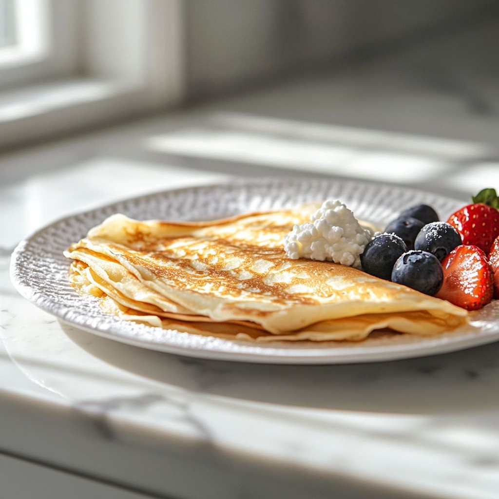 For the crepe batter: flour, eggs, milk, a little water, a pinch of salt, and a small amount of melted butter or oil. For the filling: cottage cheese (classic), a touch of sugar or honey, vanilla or lemon zest for flavor, and optional yogurt or cream to loosen texture. You’ll also need butter or oil for cooking the crepes.